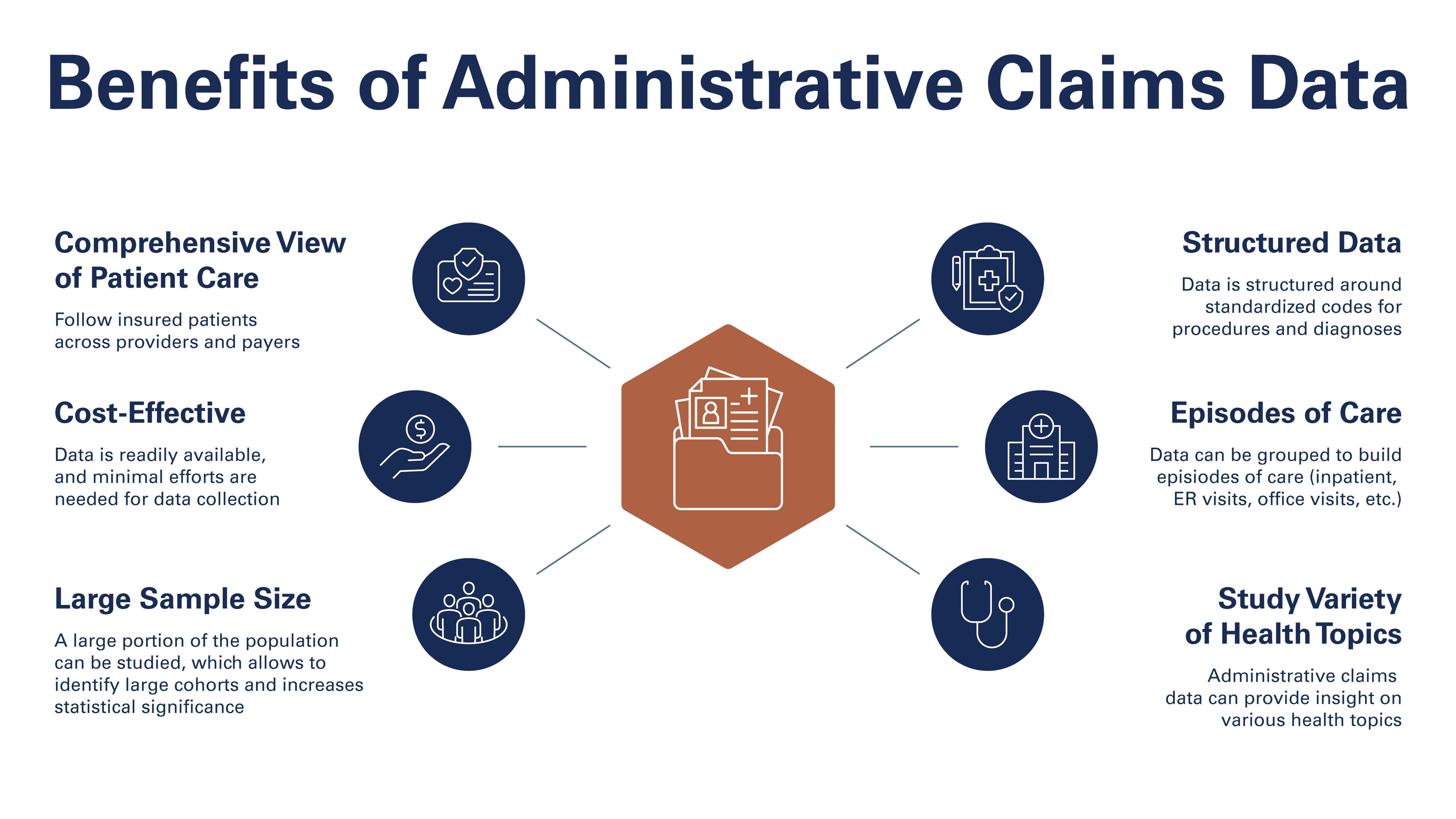 Beyond claims, the datasets often incorporate enrollment information with demographic details, which establish who is eligible for insurance coverage, as well as provider-specific data. Collectively, claims data serve as a valuable resource to study healthcare utilization, costs, quality of care, and health outcomes across large populations.
