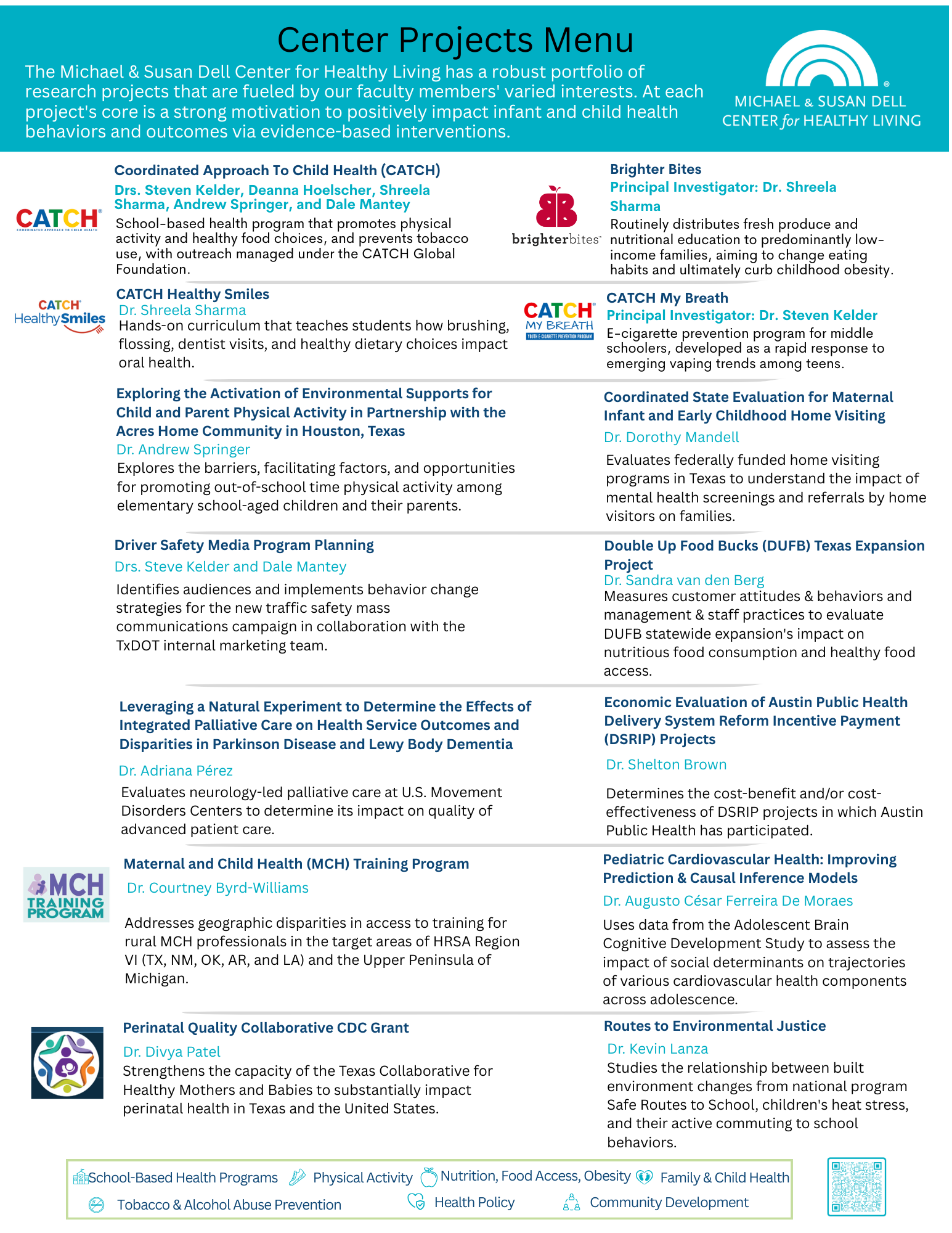 We seek new discoveries in child health through research-focused programs related to school-based health; nutrition, food access, obesity; family & child health; tobacco, e-cigarettes; physical activity; health policy; heat safety; and road safety.